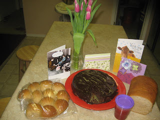 Here's some of the gifts that were brought to me on my birthday. I was very spoiled and felt very loved. Our R.S president made me this beautiful french chocolate torte. It was heaven! I hid this cake very carefully in the fridge, I was a little selfish with it too. Sister Bender also made me the most perfect loaf of bread I've ever seen. I had another friend bring me some homemade rolls and jam. Homemade bread and jam is probably my most favorite thing to eat.